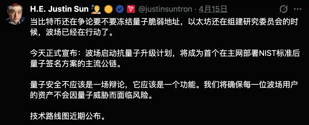也正是在这个时间点上,Justin Sun 将波场 TRON 的抗量子升级摆上了桌。并不是仅仅为了发声,而是正式宣布将在主网部署符合 NIST 标准的后量子签名方案,目标是成为第一个真正把这件事落到主网的主流公链。